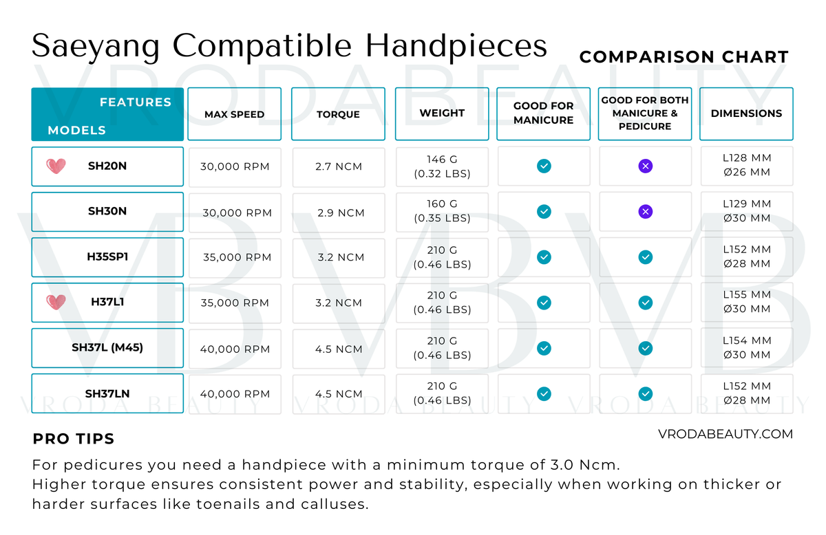 SH37L (M45): The most powerful handpiece that operates at an impressive 40,000 RPM rotation speed that are good for pedicure and manicure.