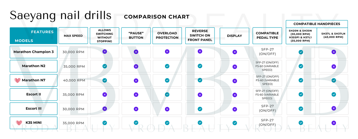 Compatible with a wide range of attachments, the Saeyang Marathon N7 is versatile enough to meet various needs in nail care, from shaping and polishing to nail art. Its reliability and ease of use make it a popular choice in salons and for home use alike.