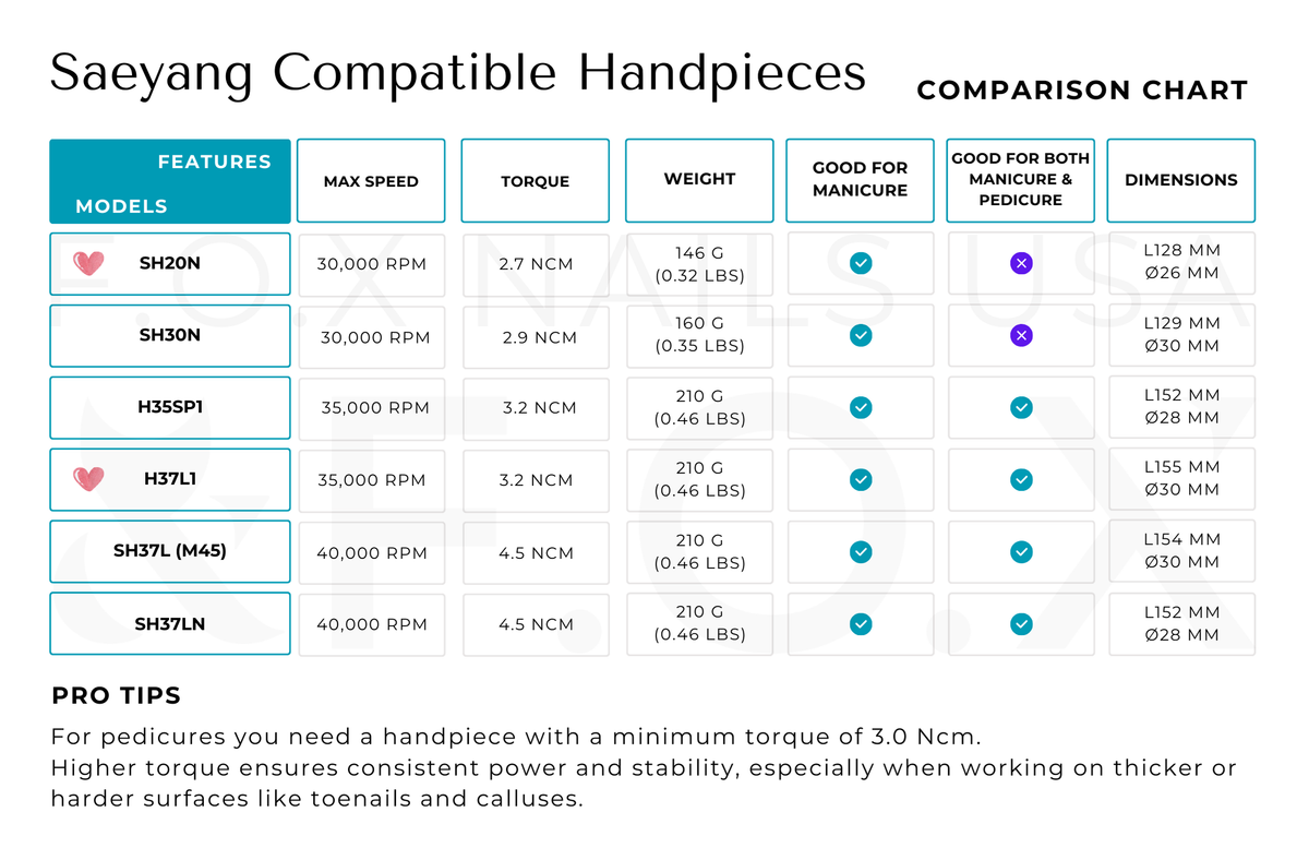 - Maximum Torque: 3.2 Nm, making it suitable for both manicures and pedicures.